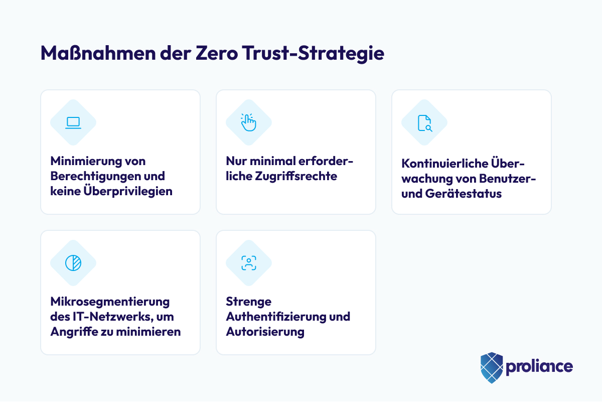 Das wichtigste Prinzip von Zero Trust lautet „Vertraue niemandem, verifiziere immer“. Eng damit verbunden ist das Least-Privilege-Prinzip: Unternehmen sollten Berechtigungen auf ein Minimum reduzieren und einzelnen Nutzern keine zu umfangreichen Privilegien einräumen. Außerdem sollten Organisationen regelmäßig die Identität und den Status von Nutzern und Geräten validieren, um Anomalien frühzeitig zu erkennen.