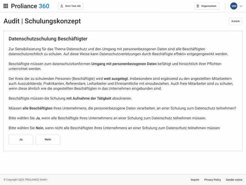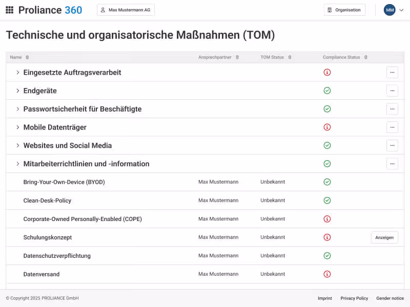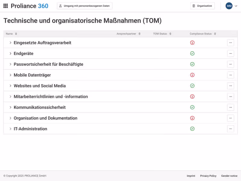Sie benötigen eine strukturierte Übersicht aller technischen und organisatorischen Maßnahmen aus den 14 Kontrollbereichen (Zutrittskontrolle, Zugangskontrolle, Verschlüsselung etc.). Diese müssen Sie nach Risiko bewerten, dokumentieren und für Audits bereithalten. Mit einer TOM-Software wie Proliance 360 dokumentieren Sie alle Maßnahmen zentral, nutzen vorkonfigurierte Vorlagen und behalten den Compliance-Status im Blick.