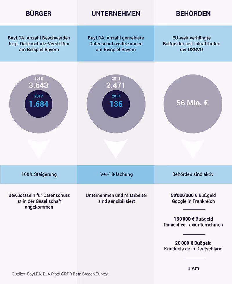 In der unten abgebildeten Übersicht sehen Sie anhand weniger Zahlen, wie sich die Lage innerhalb eines Jahres geändert hat. Sie werden feststellen: Die EU-DSGVO ist angekommen.