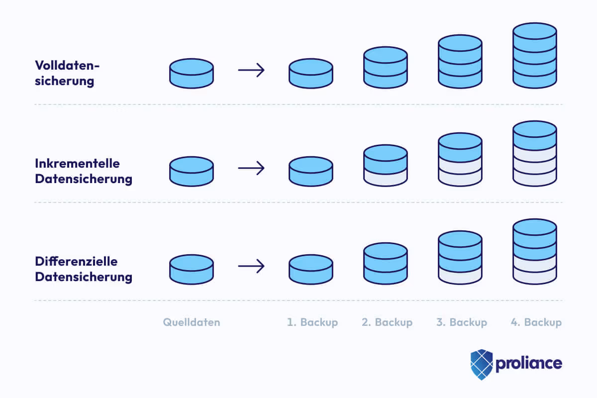 Es gibt verschiedene Methoden zur Datensicherung. Grundsätzlich sind für Unternehmen die folgenden drei Arten der Datensicherung relevant. In welchem zeitlichen Abstand Sie Ihre Daten sichern sollten, muss individuell entschieden werden und hängt von verschiedenen Faktoren ab, zum Beispiel, wie kritisch die zu sichernden Daten sind.