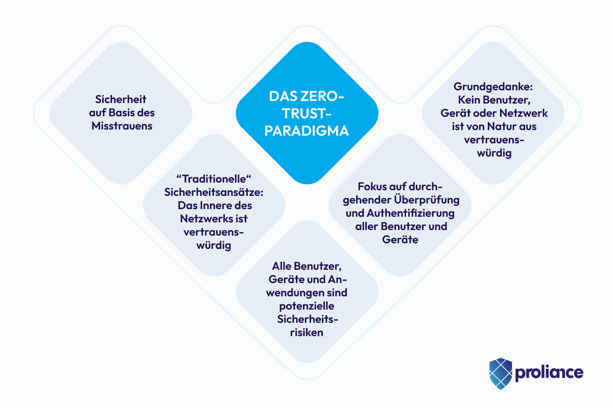Das Paradigma lautet: „Vertraue niemandem, hinterfrage alles“ und beruht auf dem Prinzip der minimalen Reche aller Entitäten in der Gesamtinfrastruktur.