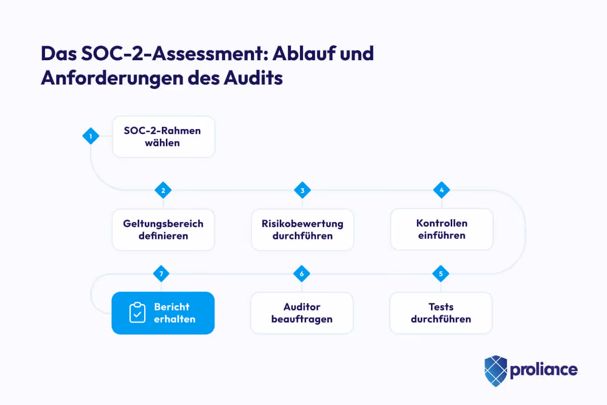 - Proliance unterstützt bei der Schwachstellenanalyse, Prüferwahl und Prüfung des SOC-2-Berichts.