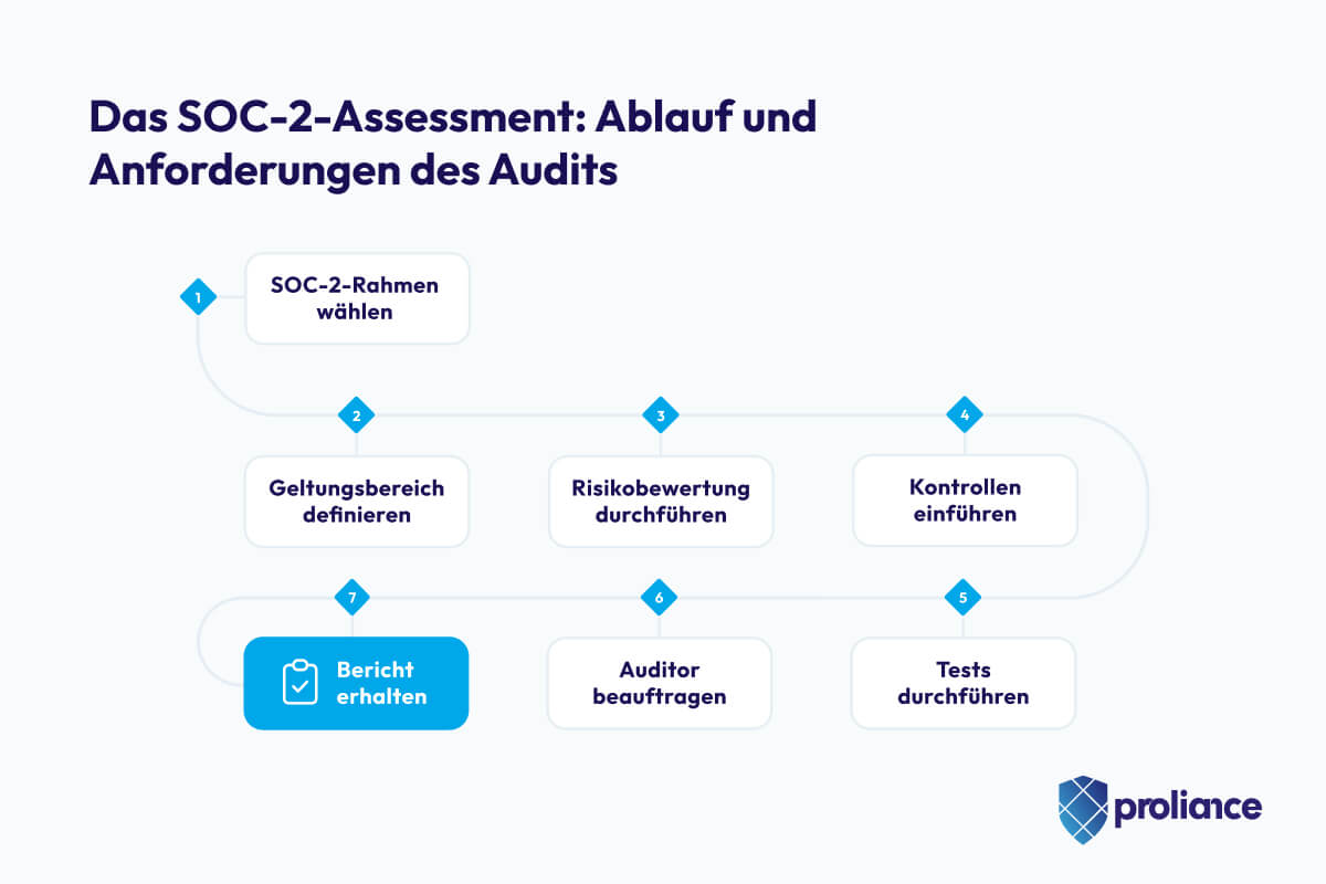 Der Audit-Prozess für einen SOC-2-Report folgt einem klar definierten Ablauf. In der Regel müssen Unternehmen im Rahmen des SOC-2-Assessments die folgenden sieben Schritte durchlaufen: