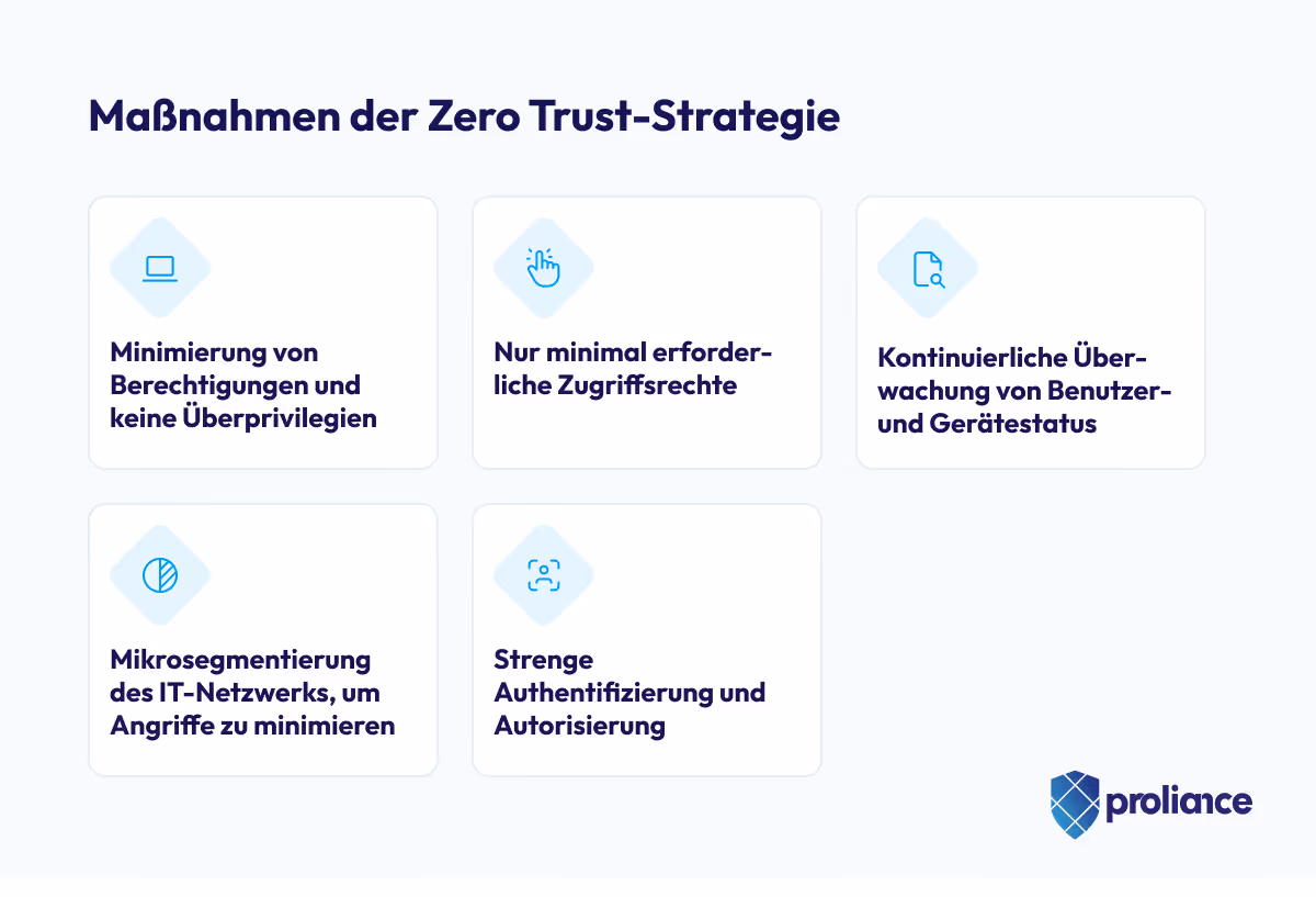 Das wichtigste Prinzip von Zero Trust lautet „Vertraue niemandem, verifiziere immer“. Eng damit verbunden ist das Least-Privilege-Prinzip: Unternehmen sollten Berechtigungen auf ein Minimum reduzieren und einzelnen Nutzern keine zu umfangreichen Privilegien einräumen. Außerdem sollten Organisationen regelmäßig die Identität und den Status von Nutzern und Geräten validieren, um Anomalien frühzeitig zu erkennen.
